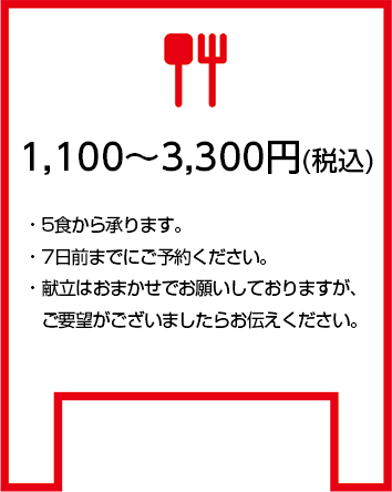 テイクアウト弁当(ロケ弁) 1,100円弁当(税込) 10食から承ります。 7日前までにご予約ください。 ご要望にお応えできない場合もございますのでご了承ください。 1,100~3,300円弁当(税込) ※2,700円(税込)のお弁当の一例です